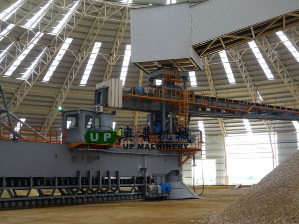 圓形料場橋式刮板混勻堆取料機,適用于原料的預均化堆場。占地面積小、可連續進行堆料、取料作業,全自動程序控制。是水泥、煤炭等散狀原料理想的均化設備。該設備的主要特點是:堆取料機采用人字形堆料和全斷面取料的堆取料工藝。堆料機在PLC程序下,堆料臂往復回轉,同時在一次往復回轉過程中完成從上升到下降的周期變幅變速運動,完成連續人字形堆料工藝。取料機通過運行在圓形軌道上的端梁圍繞中心柱的料場內運行,同時料耙沿橋梁往復運行實現全斷面取料,然后通過刮板輸送系統將物料刮至中柱底部經地坑膠帶機運出。