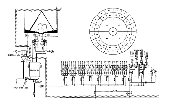 CP生料均化庫是我公司引進的德國BMH公司的一種新型生料均化庫,其特點電耗低、均化效果好。CP生料均化庫的均化原理是庫頂生料通過8條斜槽均勻布料,不同時期的生料在庫內呈橫向分布,庫底充氣系統設計更符合生料充氣后的流動性,呈放射狀斜向分布,環形區一般分8個區,每隔5分鐘輪流充氣,充氣區生料因松動及氣流的引導卸入中心區,庫內不同層的生料豎向切割下料實現生料的均化,不同時間的生料進入中心區后再進行氣體強烈混合均化,從而達到理想的均化效果。