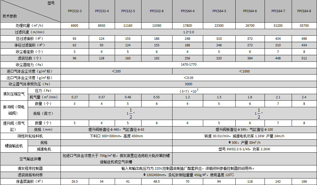 ·PPCS64型氣箱式脈沖袋收塵器技術(shù)性能表