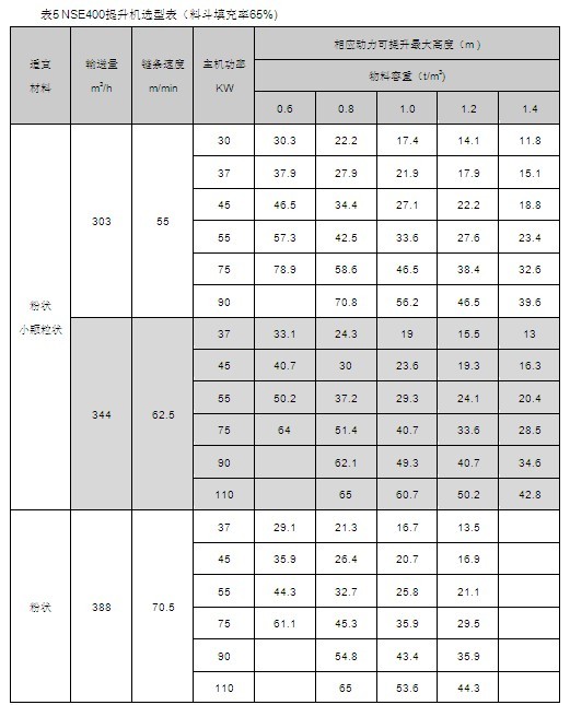 NSE系列高速板鏈斗式提升機共有九種基本型號:NSE100、NSE200、NSE300、NSE400、NSE500、NSE600、NSE700、NSE800、NSE1000,每種型號根據輸送物料的不同,選擇不同的提升速度,提升速度上限<70m/min,提升高度上限65m。另外,奧普公司還可根據用戶要求輸送量介于上述型號之間的擴展型號。